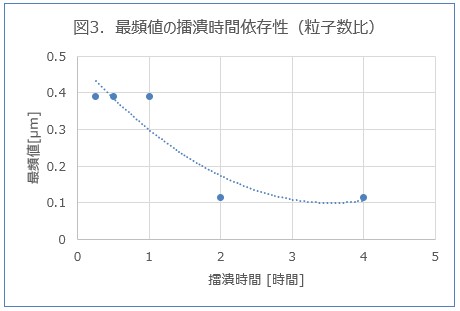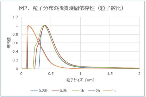 この結果から、最頻値は擂潰時間が長くなるにつれて小さくなりますが、2 時間程度で飽和し、0.1 μm で一定となることが確認されました。