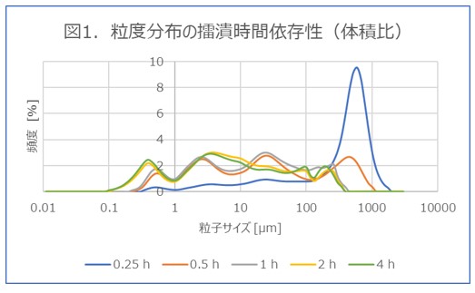 レーザー回折粒度測定(HORIBA 製 LA-950V2)を用い、15分から4時間まで擂潰時間を変化させ、粒度分布の変化を粒子数比で精密に分析しました。
