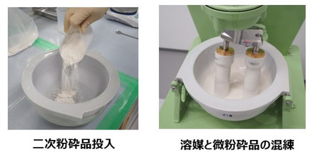 微粉砕・粒度調整の工程では、石川式18号自動乳鉢が使用されている。まず、焼成後の牡蠣殻粉末に対して乾式で一定粒径まで粉砕処理を行う。その後、同じ装置内に溶媒を添加し、湿式状態で均質な混合を実施する。この段階で、牡蠣殻粉末と溶媒は密度差があるにもかかわらず、乳棒の回転圧力により効率よく混合される。