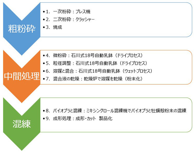 本事例で製造されたのは、牡蠣殻をベースとした無機フィラーをバイオプラに混練した無機フィラー入り樹脂材料である。粉砕、焼成、分散、乾燥、混練といった各処理工程はすべてDJK様社内で完結しており、工程間の一貫性と再現性の高い処理が実現されている。