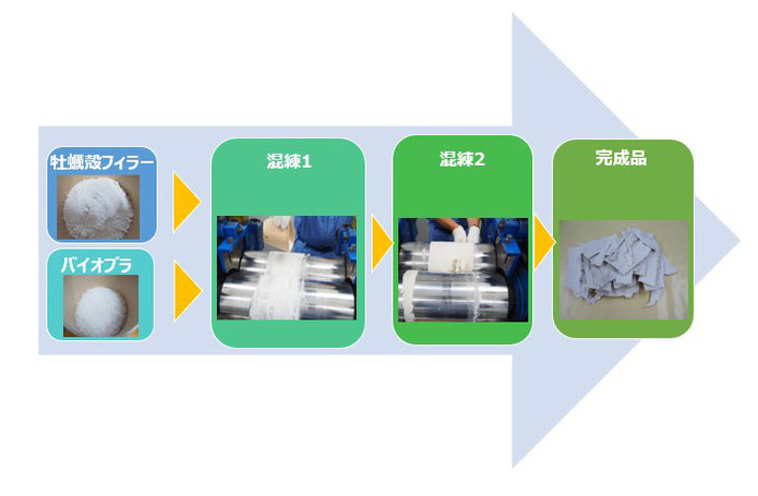 自動乳鉢で得られた混合液は、乾燥処理によって再び粉末化される。この乾燥粉末が最終的な無機フィラーとなり、次の工程へと渡される。最終段階では、バイオプラ(生分解性樹脂)との混練が行われる。加熱状態のミキシングロール混練機によってフィラーとポリマーが均一に混ざり合い、成形・プレス処理を経て、無機フィラー入り樹脂材料が完成する。